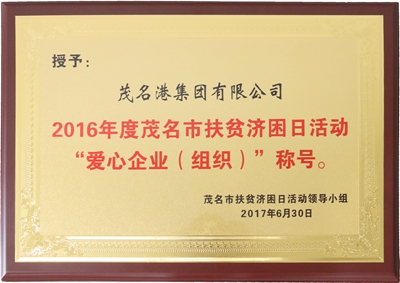 • 2016年度茂名市扶貧濟(jì)困日活動(dòng)“愛(ài)心企業(yè)(組織)”稱(chēng)號(hào)