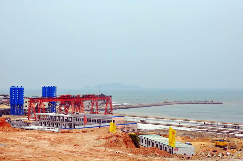 東防波堤工程全長(zhǎng)5423米,西防波堤工程全長(zhǎng)3315米,口門寬度600米?陂T堤頭段采用直立式沉箱結(jié)構(gòu),其他堤身段采用拋石斜坡堤結(jié)構(gòu),共需拋填各類石料1060萬m3,澆筑混凝土82.6萬 m3,項(xiàng)目總投資為25.45億元,建安費(fèi)17.94億元。東西防波堤建成后,形成港池面積6平方公里,岸線10850米,可建3-30萬噸級(jí)泊位30-35個(gè),設(shè)計(jì)吞吐量2億噸。