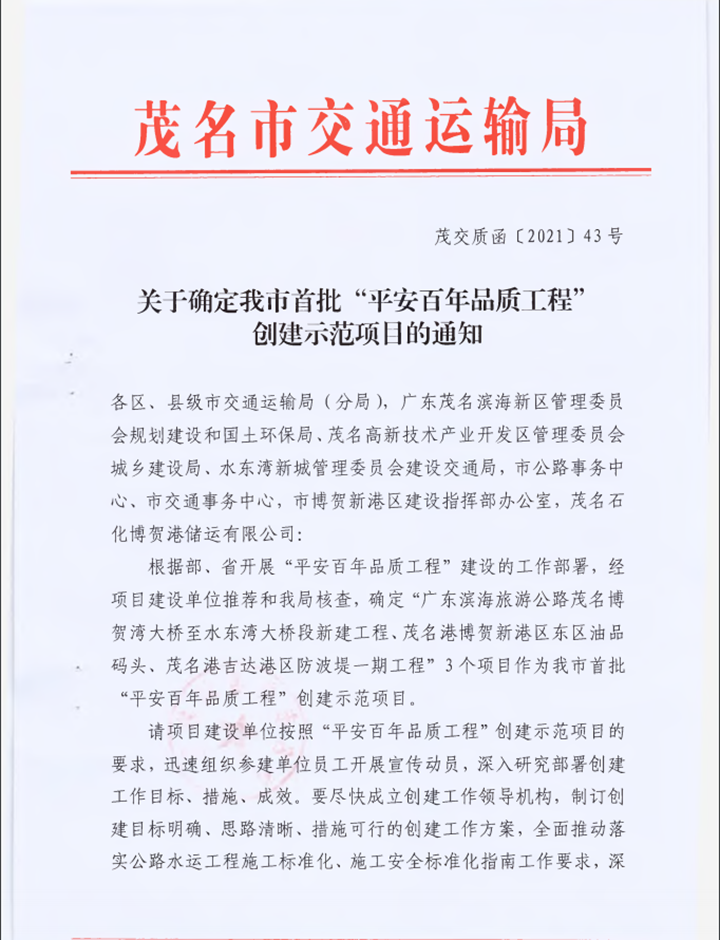 近日,茂名市交通運(yùn)輸局在全市公路水運(yùn)項(xiàng)目中開展“平安百年品質(zhì)工程”創(chuàng)建示范工作。經(jīng)過(guò)層層選拔,茂名港博賀新港區(qū)東區(qū)油品碼頭工程脫穎而出,成為茂名市首批“平安百年品質(zhì)工程”創(chuàng)建示范項(xiàng)目!