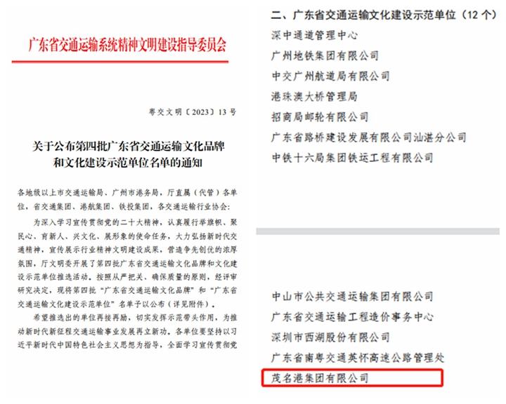 日前,廣東省交通運輸系統(tǒng)精神文明建設(shè)指導委員會公布了第四批廣東省交通運輸文化品牌和文化建設(shè)示范單位名單,茂名港集團被評為“廣東省交通運輸文化建設(shè)示范單位”。