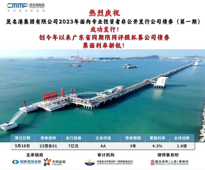 熱烈慶祝茂名港集團(tuán)有限公司2023年面向?qū)I(yè)投資者非公開發(fā)行公司債券(第一期)成功發(fā)行!