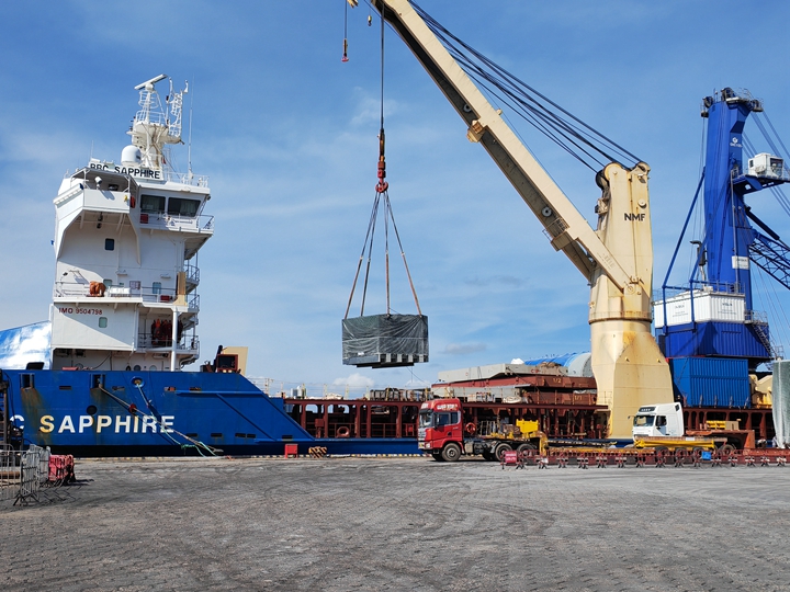 近日,外貿(mào)船舶“藍(lán)寶石”輪順利靠泊港口經(jīng)營公司碼頭裝運(yùn)大型外貿(mào)設(shè)備,這是港口經(jīng)營公司今年以來首次靠泊的萬噸級外貿(mào)船舶。