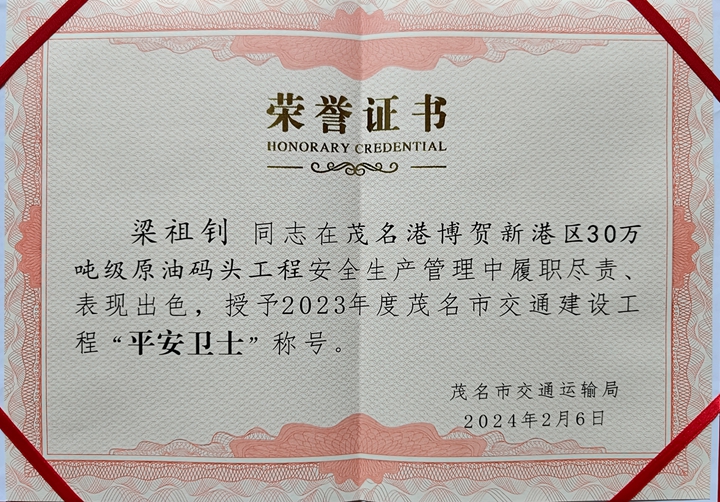 茂名市交通建設(shè)工程“平安衛(wèi)士”、30萬噸級原油碼頭工程項目經(jīng)理梁祖釗表示:“30萬噸級原油碼頭工程項目榮獲“平安工地”榮譽稱號,不僅是茂名市交通局對我們項目團隊辛勤付出的肯定,更是對我們安全管理工作的最高褒獎。作為項目經(jīng)理,我深感榮幸與自豪,同時也深知這份榮譽背后所承載的責任與擔當。在集團黨委的堅強領(lǐng)導(dǎo)和集團安環(huán)委的正確指導(dǎo)下,我將繼續(xù)和項目團隊成員共同努力把項目安全工作抓好管好!為集團重點項目高質(zhì)量建設(shè)保駕護航!”(通訊員:張春浩)