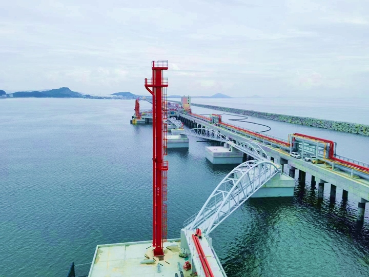 此次安裝的4臺裝卸臂堪稱碼頭“大動(dòng)脈”,每臺高23.3米、重41.83噸,采用電/液驅(qū)動(dòng)技術(shù),具備高效、安全、穩(wěn)定的輸油能力,全部投用后,每年可助力完成1650萬噸原油輸送任務(wù),將大幅提升茂名港原油接卸與中轉(zhuǎn)效率。同步安裝的具有浮動(dòng)功能的登船梯高26.5米、重約32噸,根據(jù)潮汐自動(dòng)調(diào)節(jié)梯高度的智能設(shè)計(jì),為10萬到30萬噸級的船舶提供了安全便捷的通道;2座高29米的消防炮塔上的消防水炮最大覆蓋半徑達(dá)99米,其射程遠(yuǎn)、流量大,如同“安全衛(wèi)士”構(gòu)筑起碼頭前沿的安全保障網(wǎng)。