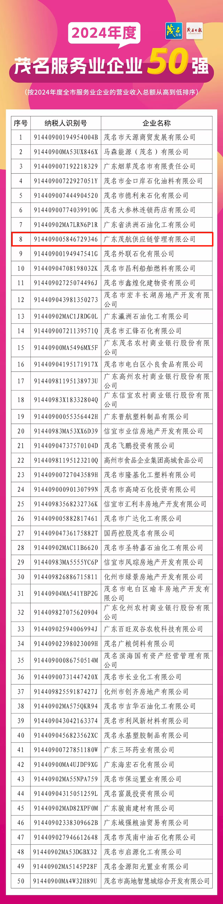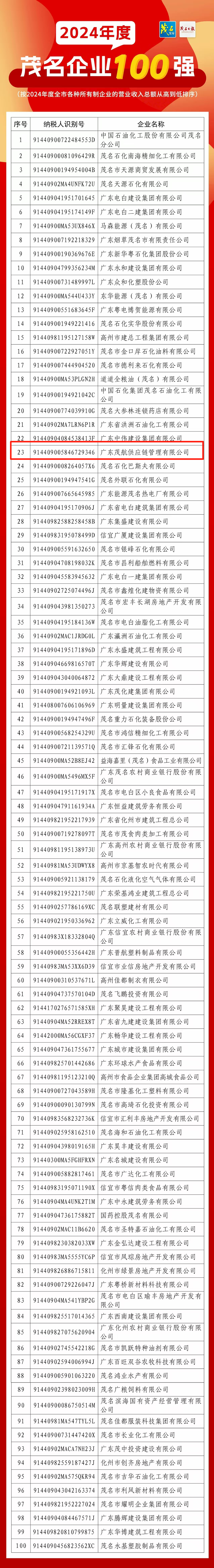 根據(jù)茂名市企業(yè)聯(lián)合會于2025年7月15日發(fā)布的通報,集團(tuán)下屬茂航供應(yīng)鏈公司以優(yōu)異的業(yè)績表現(xiàn)位列茂名企業(yè)100強(qiáng)第23位,較2023年第37位躍升14名,并首次躋身茂名服務(wù)業(yè)企業(yè)50強(qiáng)第8位。此次雙榜單的歷史性突破,標(biāo)志著茂航供應(yīng)鏈公司從傳統(tǒng)供應(yīng)鏈貿(mào)易商向供應(yīng)鏈科技企業(yè)的轉(zhuǎn)型取得實質(zhì)性成果。