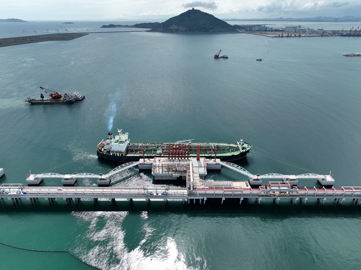 5月29日,利比里亞籍油輪"瓦萊里"號(長183米,寬32米)成功靠泊茂名石化博賀港儲運公司(以下簡稱“石化儲運公司”)10萬噸級成品油碼頭E2泊位,標(biāo)志著該碼頭正式投產(chǎn)運營。此次靠泊的"瓦萊里"號載運3.7萬噸進口石腦油,是碼頭建成后迎來的首艘油輪。